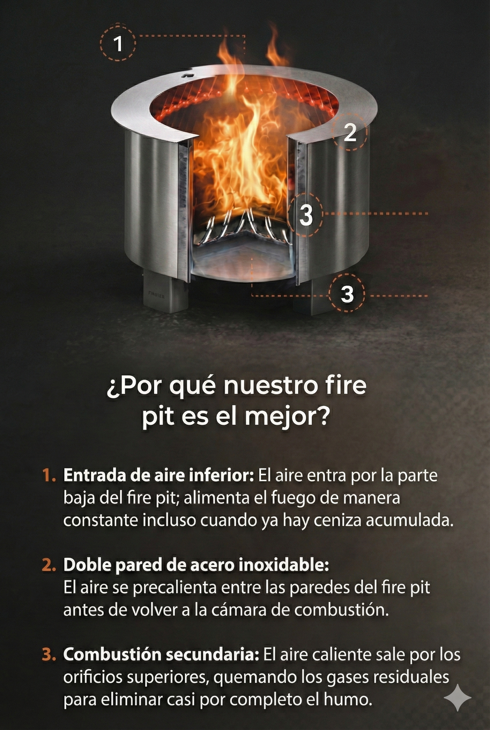 La smokeless redefine la experiencia del fuego al aire libre, combinando diseño sofisticado, ingeniería eficiente y materiales de alta calidad para crear un ambiente cálido, elegante y funcional en cualquier espacio. Diseñada para terrazas, jardines, patios o interiores ventilados, esta fogatera ofrece el placer visual y térmico de una llama viva sin el inconveniente del humo, permitiendo disfrutar momentos prolongados con total comodidad.